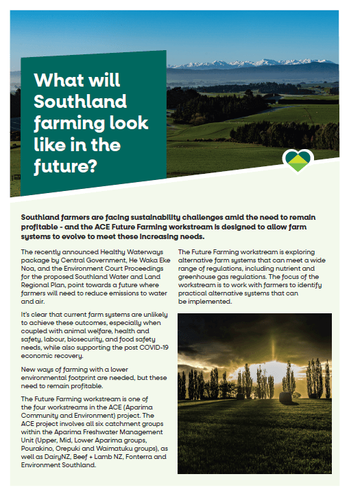 The ACE Future Farming Workstream has five farms within the Aparima FMU, that have investigated how to make changes to their farming systems to reduce their environmental footprints. Models (Overseer and Farmax) have been used to show what these changes would do to the environmental footprints, as well as how they would impact the profitability of the farms.