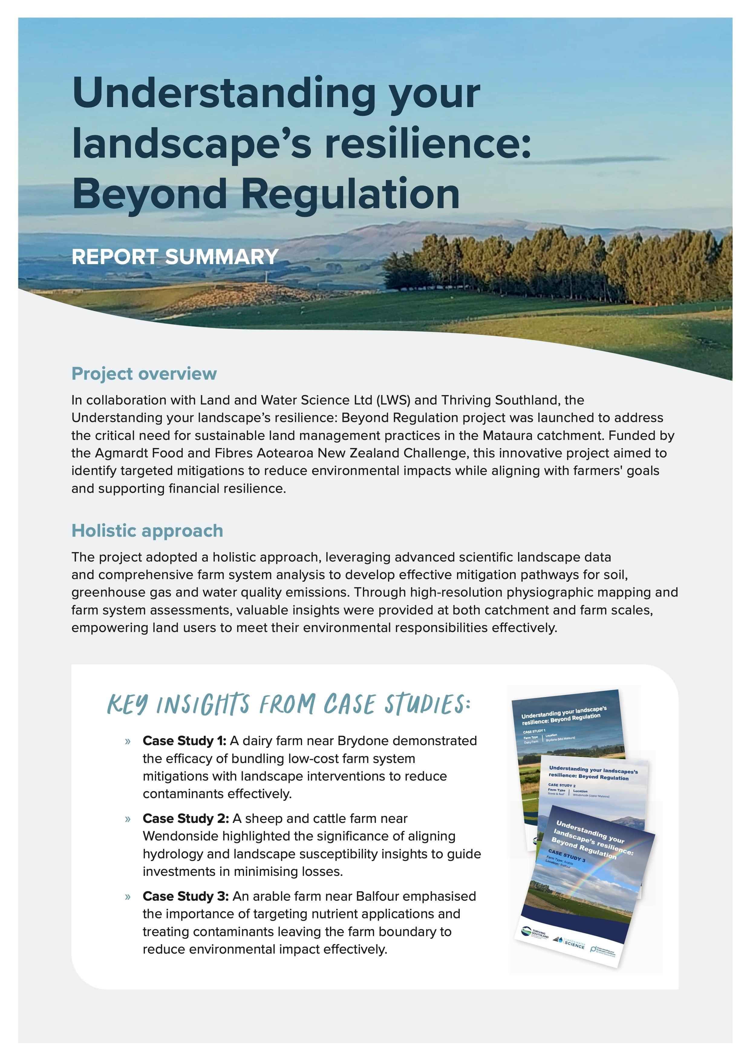 In collaboration with Land and Water Science Ltd (LWS) and Thriving Southland, the Understanding your Landscape’s Resilience: Beyond Regulation project was launched to address the critical need for sustainable land management practices in the Mataura catchment. Funded by the Agmardt Food and Fibres Aotearoa New Zealand Challenge, this innovative project identifies targeted mitigations to reduce environmental impacts while aligning with farmers' goals and supporting financial resilience.