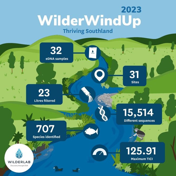 How cool is this! Wilderlab has shared with us a snapshot of our collaborative efforts around the expansion of eDNA exploration across our beautiful landscapes. They've distilled some noteworthy highlights into an infographic, showcasing key statistics from the samples submitted by Thriving Southland (plus extra samples by Catchment Groups) to us over the past year.