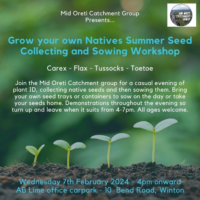 Come along and share your ideas on how the Mid Oreti Catchment Group could work in 2024 to improve our local environment. Update on x2 outgoing funded projects. We would love more project volunteers - if this sounds like you, pop along! All welcome!