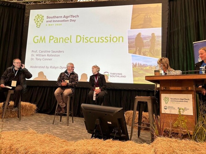 A panel discussion on genetic modification (GM) featured Professor Caroline Saunders, a well-known researcher focusing on sustainable wellbeing, farmer and biotech pioneer Dr William Rolleston, and renowned biotechnologist and geneticist Dr Tony Connor.