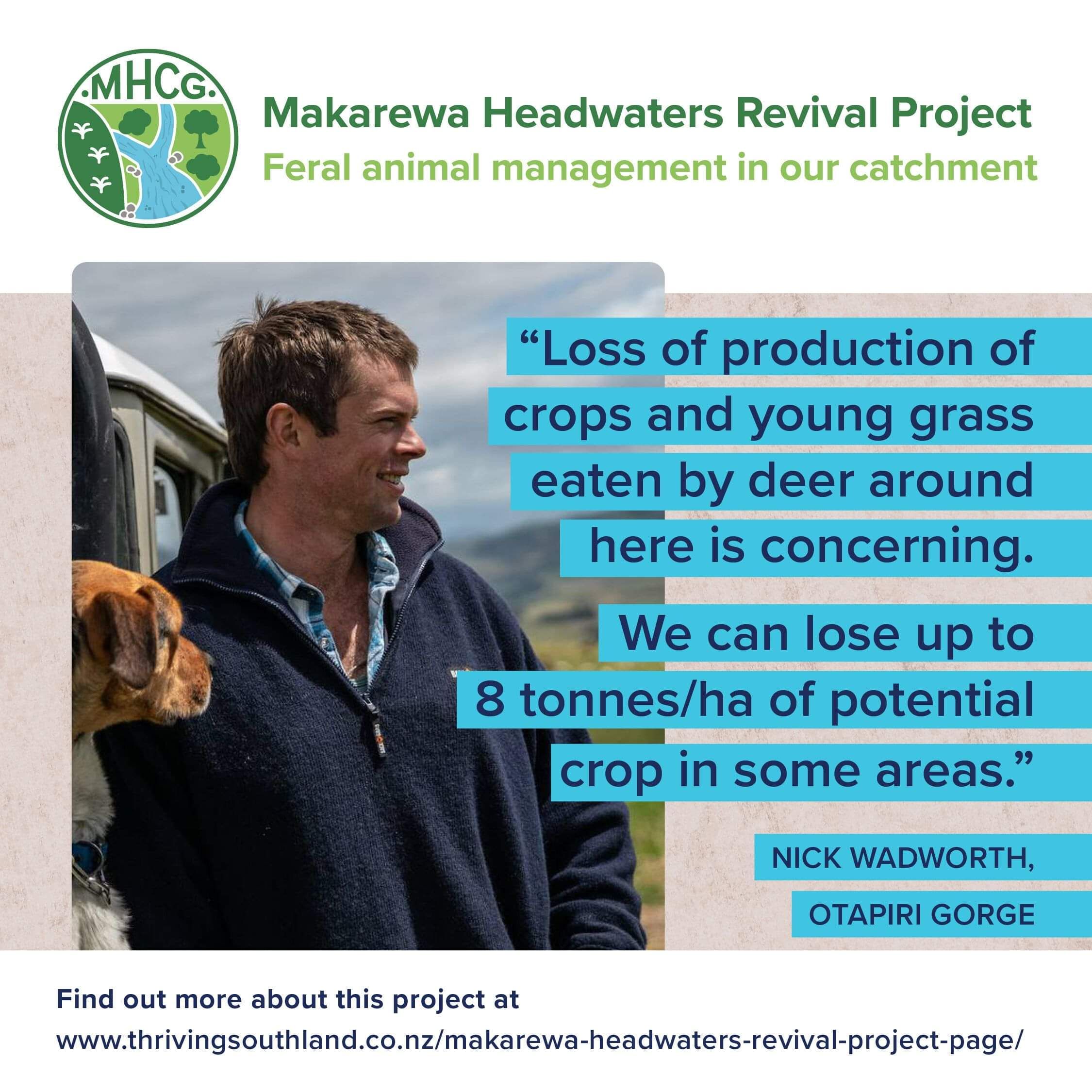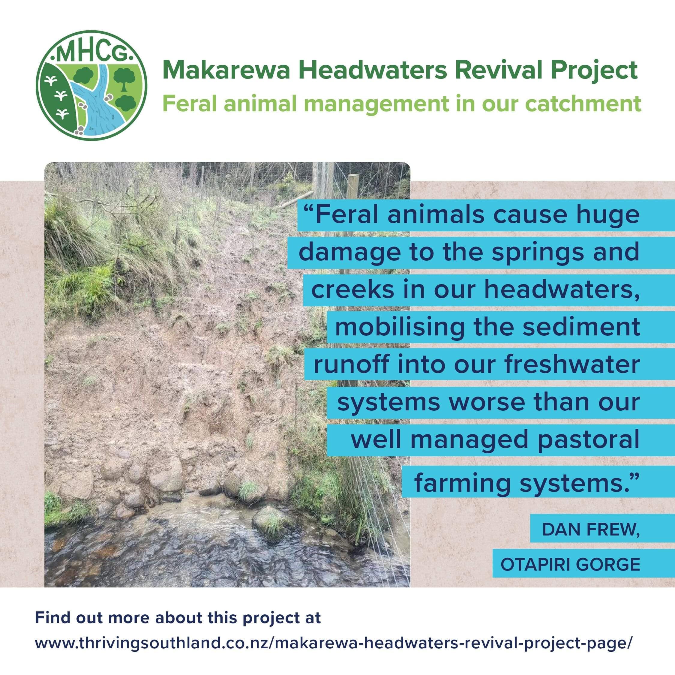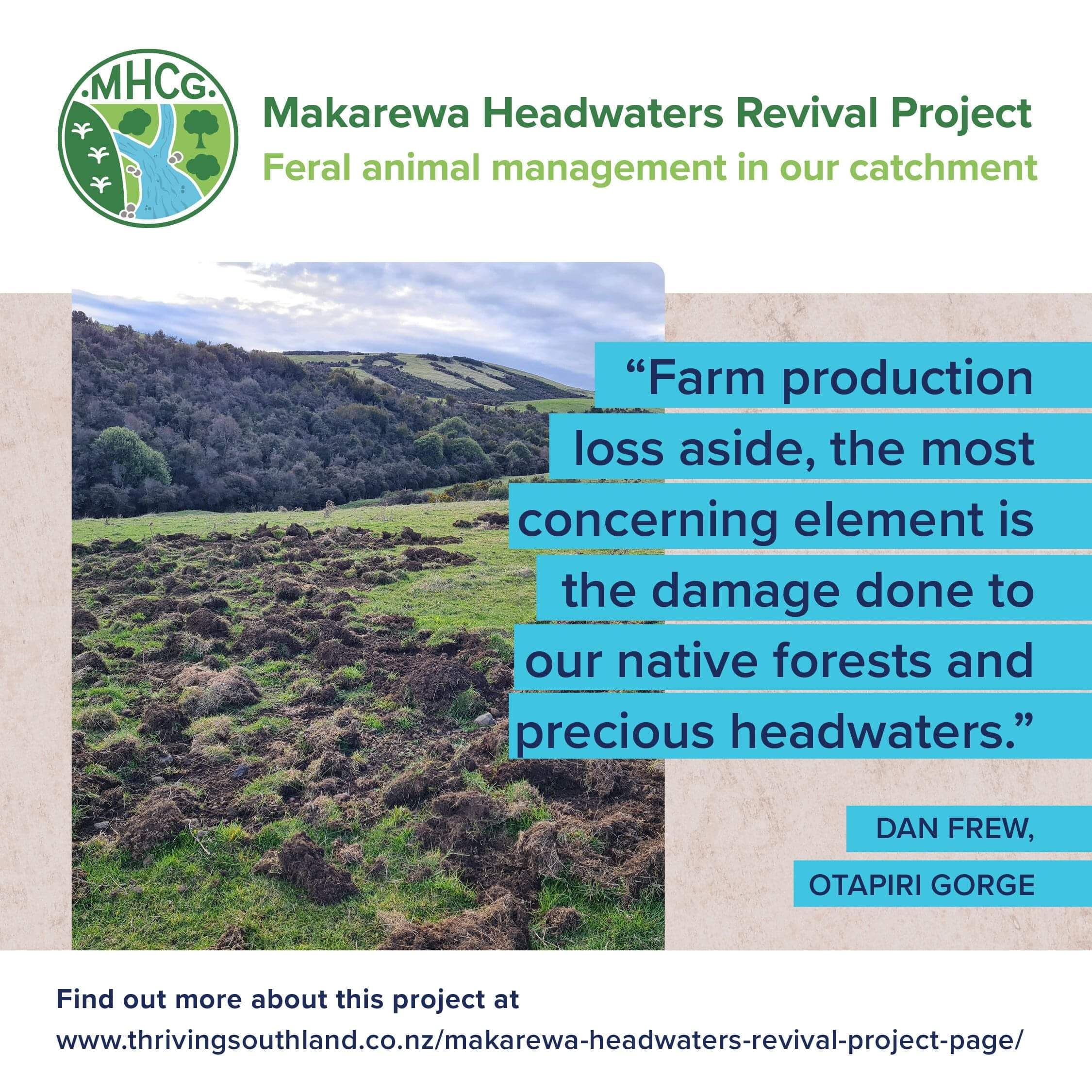 The Makarewa Headwater Catchment Group have launched a three-month project to understand the extent of the feral animal problem (including deer, pigs, goat, wild merino, wallabies - ungulate pests/ those with cloven hooves) in the Hokonuis.