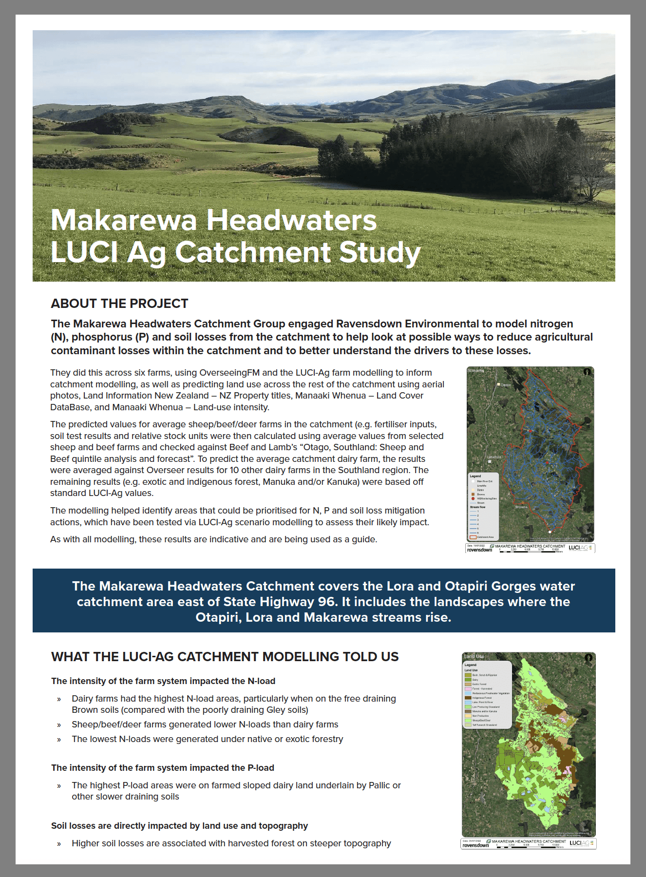 Land Utilisation Capability Indicator (LUCI-Ag) is a modelling tool which illustrates the impacts of land use on various ecosystem services. In this project the Catchment Group is teaming up with Ravensdown to model six farms within the Makarewa Headwaters catchment in order to identify nitrogen, phosphorus and sediment hotspots that impact on water quality. This work will allow for mitigation options and scenarios to be explored and help with decision making at farm level.